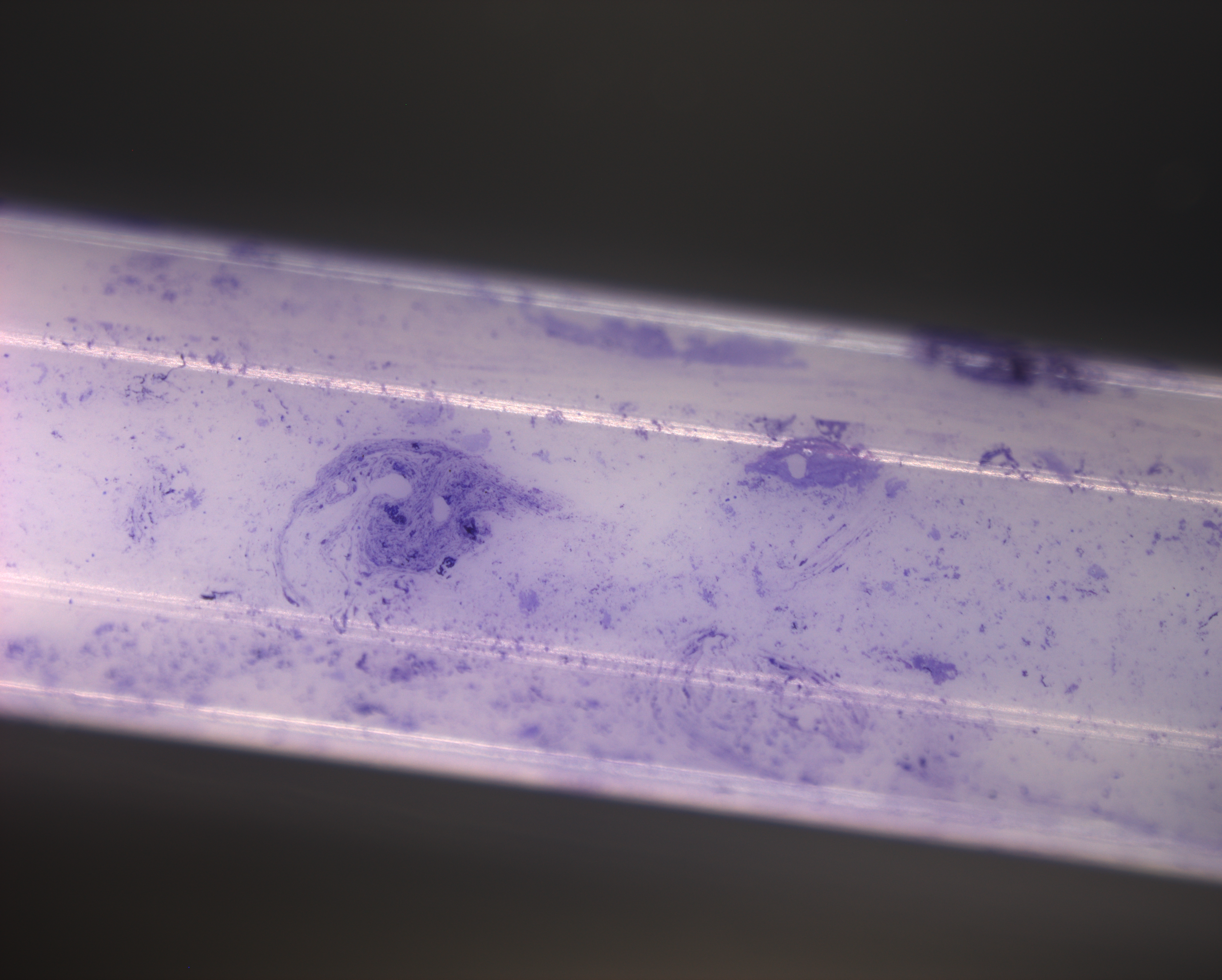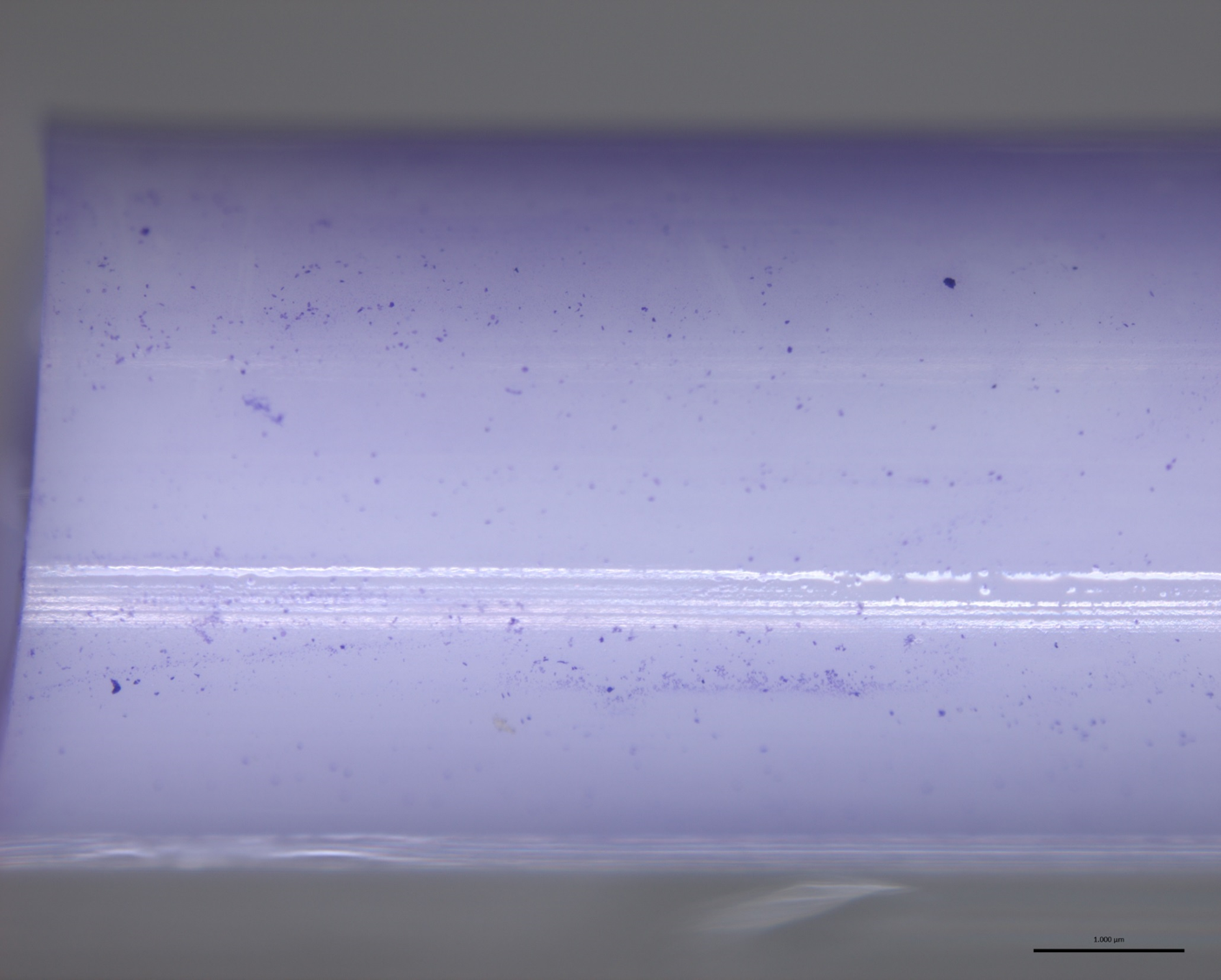 La colorazione con Cristal Violetto permette di visualizzare facilmente la presenza di biofilm (filamenti viola adesi alla superficie sul catetere commerciale,e sul carbotane tal quale), mostrando l’efficacia del trattamento plasma di interesse (carbotane trattato plasma).