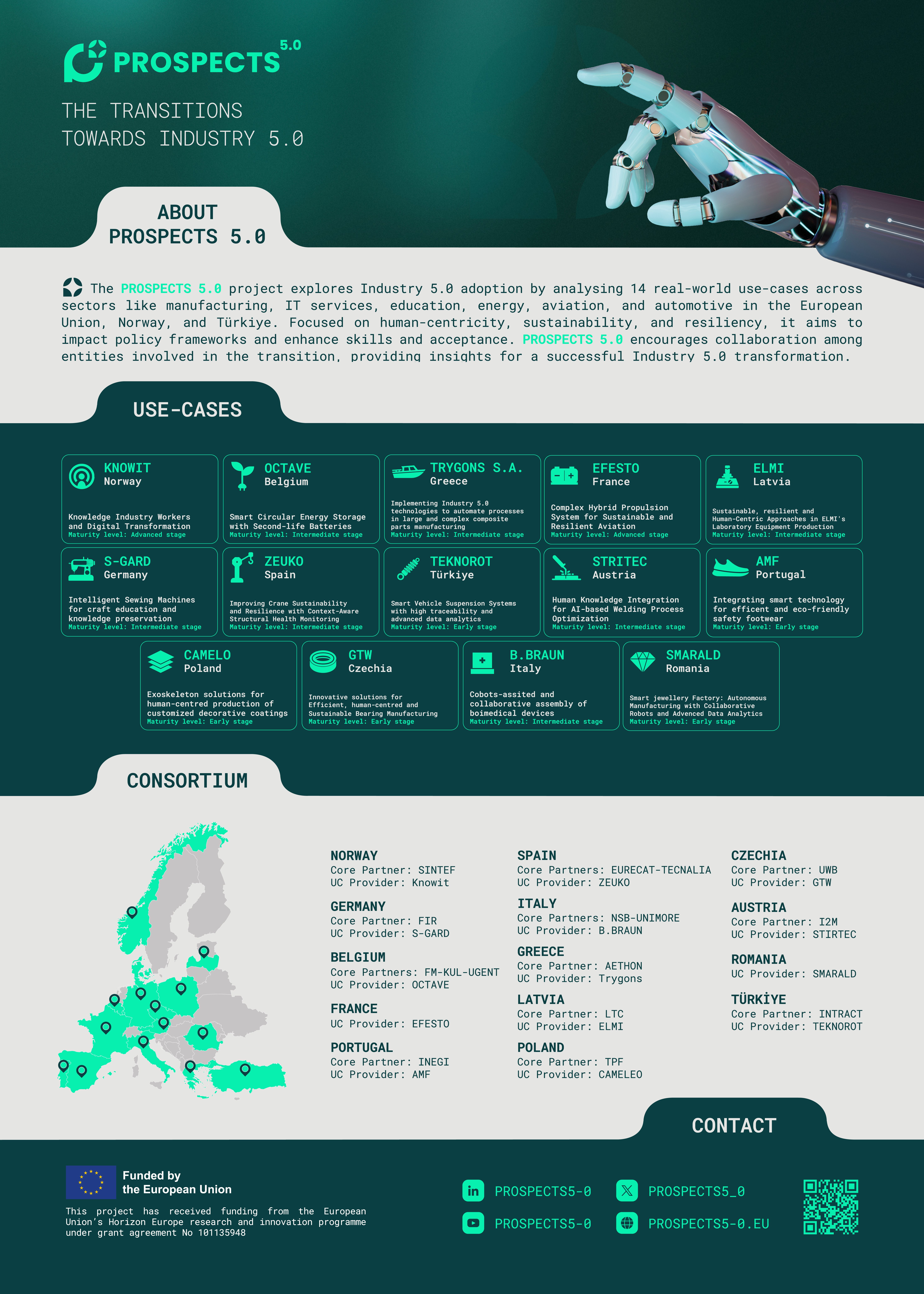 Il progetto PROSPECTS 5.0 mira a promuovere l'adozione dei principi dell'Industria 5.0, come la centralità umana, la sostenibilità e la resilienza, e a facilitare la transizione verso l'Industria 5.0 per le PMI, le start-up e le scale-up in vari settori.
