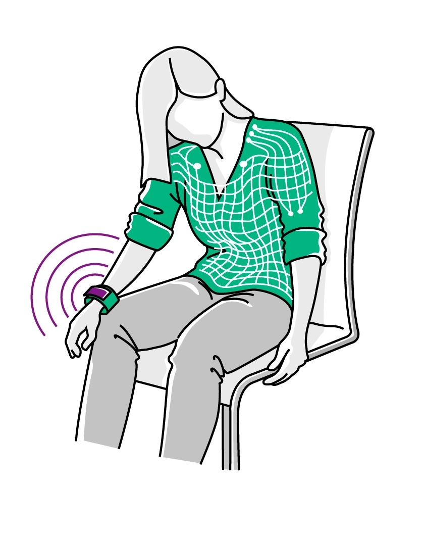 Quando Karla si è improvvisamente accasciata a pranzo, i suoi colleghi si sono naturalmente allarmati. Ma non hanno chiamato un'ambulanza, si sono limitati a far sedere Karla con attenzione. Questo perché indossava un dispositivo di primo soccorso proprio sul suo corpo. L'abbigliamento intelligente utilizza sensori intrecciati per misurare le informazioni dell'elettrocardiogramma, la frequenza cardiaca e la conduttanza cutanea, quindi utilizza un software per tenere conto delle informazioni sulla salute di Karla, come le condizioni preesistenti e le caratteristiche genetiche. Il software rileva una situazione di pericolo (un attacco cardiaco) e invia questa valutazione allo smartwatch di Karla, che lampeggia in rosso come un semaforo. L'ambulanza è in arrivo.