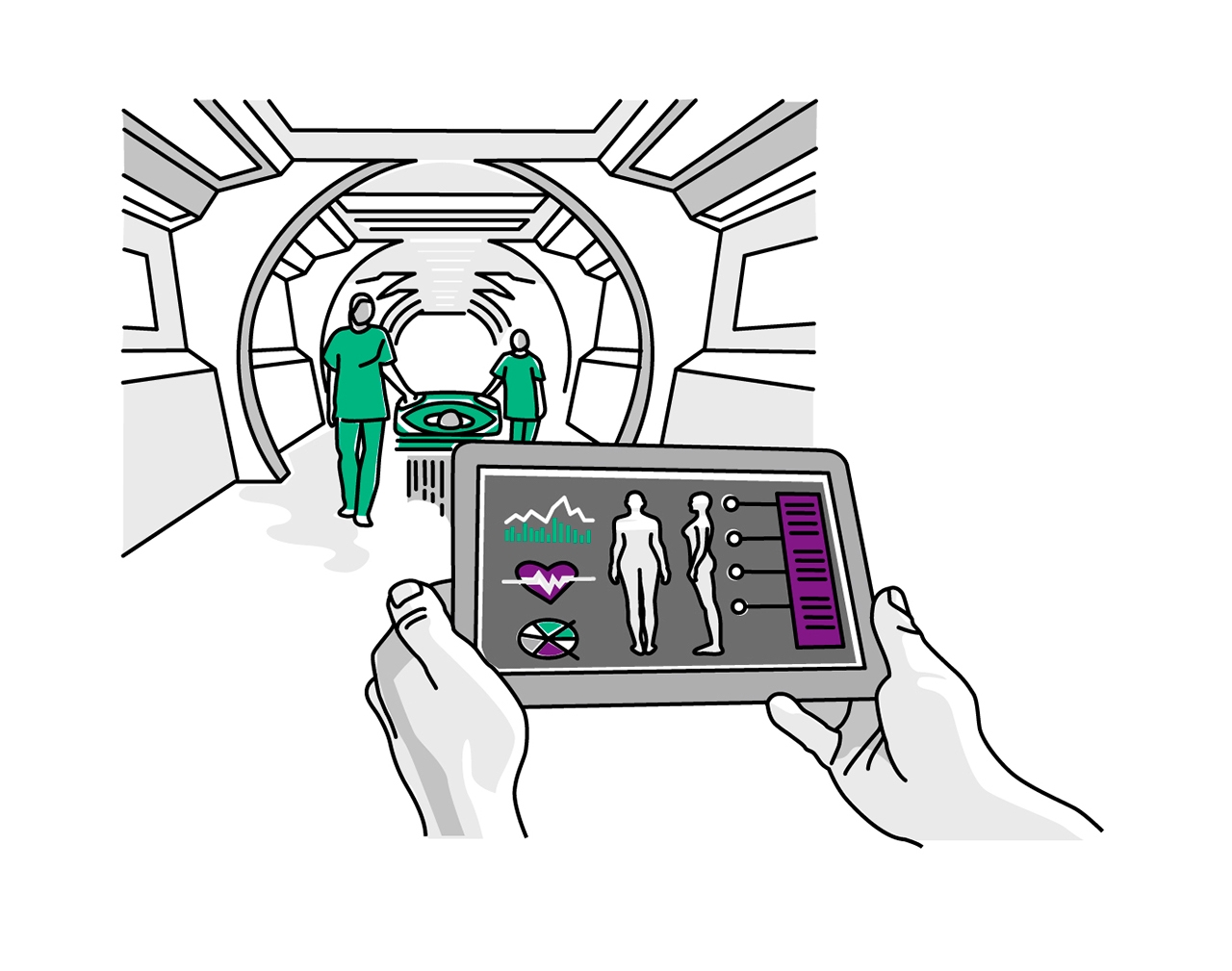Karla è arrivata in ospedale. Non è necessario fermarsi per compilare elenchi o creare un record paziente. I medici hanno già esaminato tutte le informazioni importanti su Karla sul loro tablet o smartphone prima ancora dell'arrivo, compresa un'analisi completa dell'ECG che il dispositivo di Karla sta monitorando da mesi. Nel 2040, ogni struttura sanitaria non salva più singolarmente i propri dati su un paziente. Un file digitale del paziente è disponibile per i medici in qualsiasi momento e ovunque. I medici utilizzeranno anche software speciali e database globali per ottenere informazioni, come un registro oncologico. Qui possono confrontare la loro diagnosi con altri casi in tutto il mondo. Anche il paziente ne può beneficiare. La maglietta aveva già avvertito Karla di un possibile infarto due giorni prima perché i sensori registravano dei cambiamenti nel suo ECG. Il fatto che non si sia recata dal medico è stata sua negligenza personale.