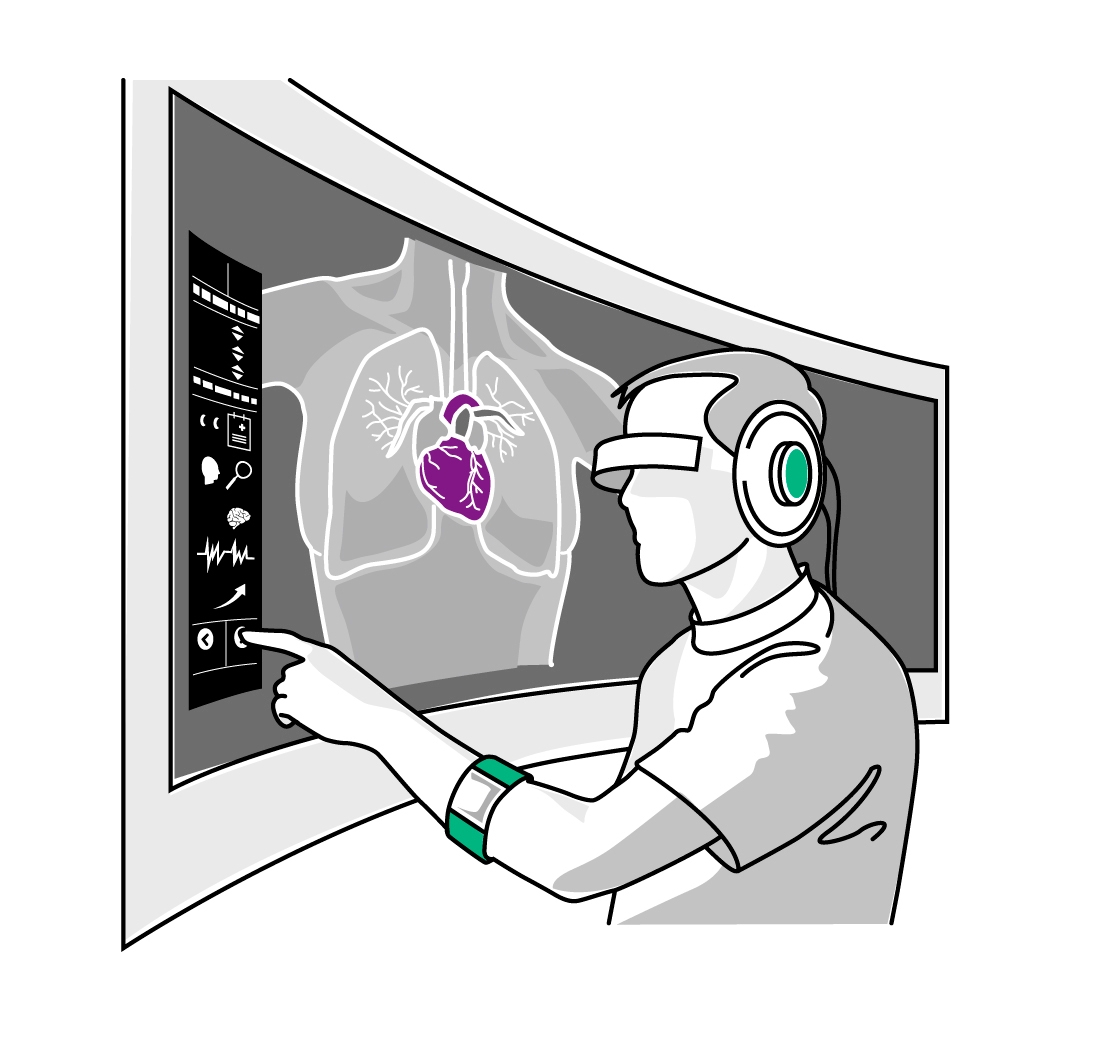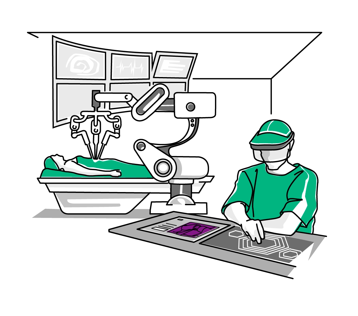 Karla è arrivata in sala operatoria a grande velocità. Per un osservatore di oggi, la stanza sarebbe incredibilmente vuota. La sala operatoria del futuro sarà dotata di un numero significativamente inferiore di dispositivi. Non sono disponibili monitor di grandi dimensioni, ad esempio per immagini MRT o tubi radiogeni. Il chirurgo potrebbe essere praticamente da solo. Sullo schermo integrato di un paio di occhiali intelligenti, i chirurghi saranno in grado di ingrandire il paziente e le singole parti del corpo e di avere tutte le informazioni importanti davanti a loro su un'unica schermata. Poiché il software aveva già decodificato il genoma di Karla anni fa, i medici sono stati in grado di selezionare il metodo operatorio che era chiaramente migliore per il suo tipo genetico. Prima di iniziare, il chirurgo di Karla controlla la programmazione del robot chirurgico.