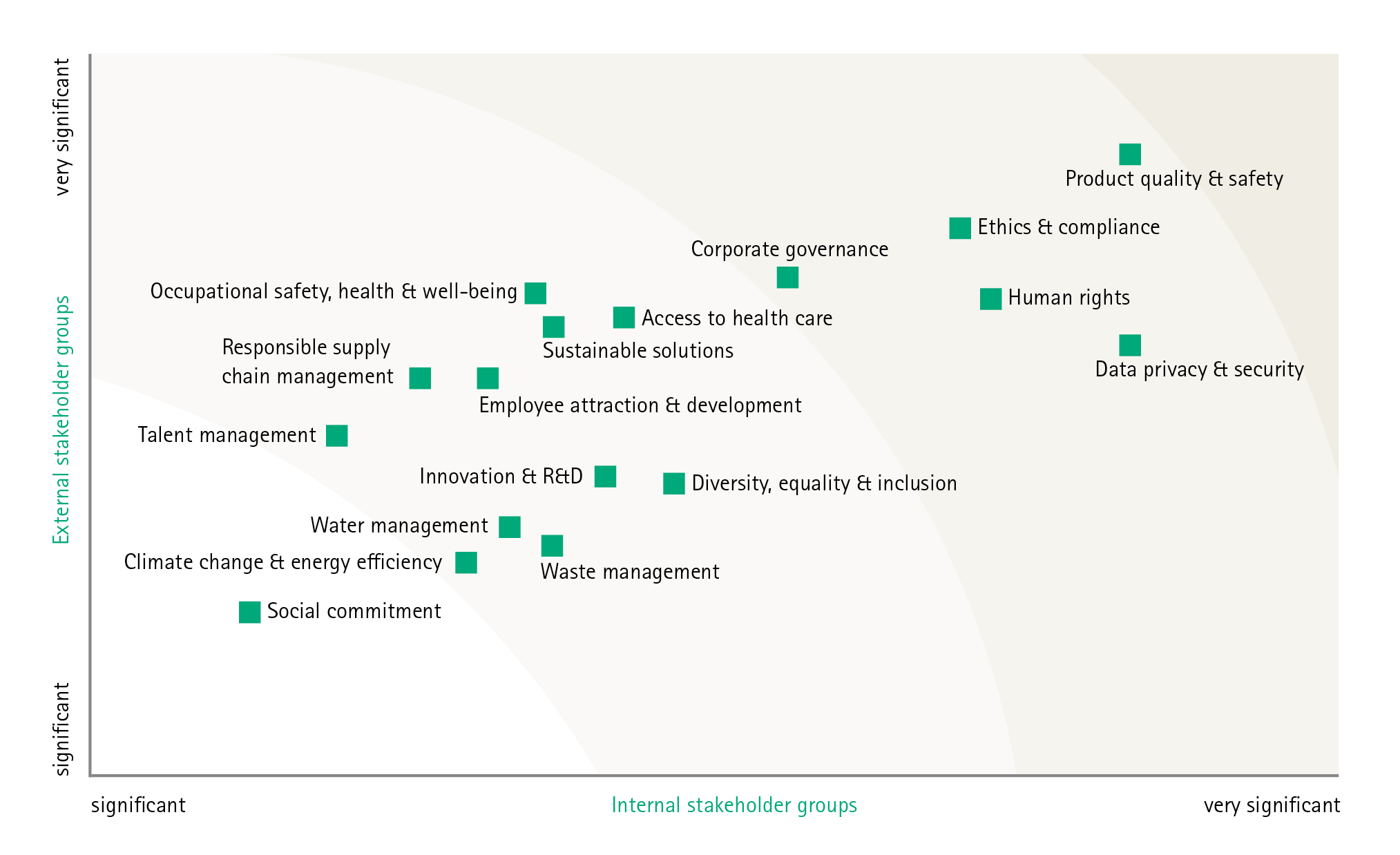L'ultima analisi è stata effettuata nel 2021. I risultati confermano che i temi relativi a qualità e a sicurezza dei prodotti hanno la massima priorità. nche i principi etici e i diritti umani sono molto importanti per noi e li colleghiamo agli standard sociali, in particolare nella supply chain. La sicurezza e la protezione dei dati, in seguito alla trasformazione digitale delle aziende e della società, continuano a essere di crescente importanza per noi. Stiamo pianificando di aggiornare la nostra matrice di materialità per il 2023 utilizzando per la prima volta un'analisi di materialità. Questo non solo ci aiuterà a identificare gli effetti specifici delle nostre attività commerciali sui vari aspetti della sostenibilità, ma anche a portare in primo piano gli effetti dell'ambiente, del cambiamento climatico e della società sui nostri risultati aziendali.
