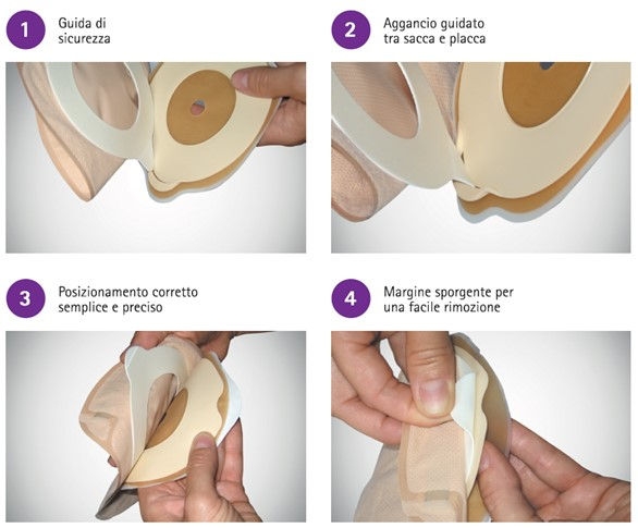 Il dispositivo presenta una scanalatura per accompagnare e guidare l’aggancio tra sacca e placca, permettendo un corretto posizionamento, in modo semplice e preciso. Inoltre, il la linguetta sporgente permette una facile identificazione per la rimozione della sacca.