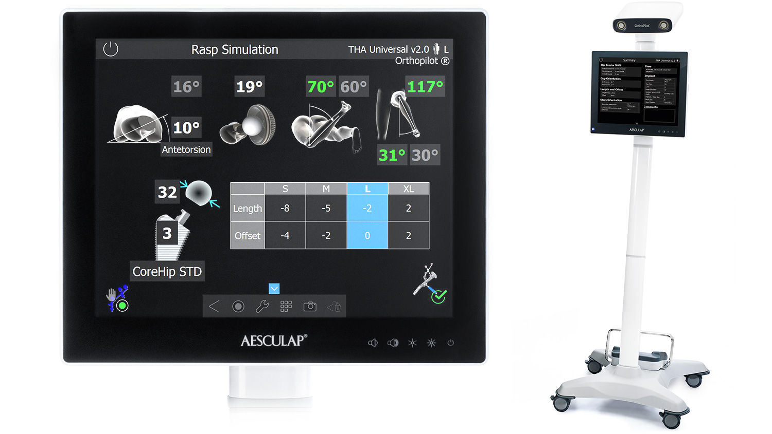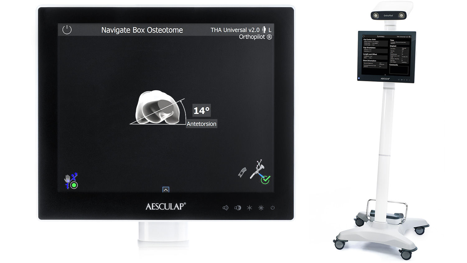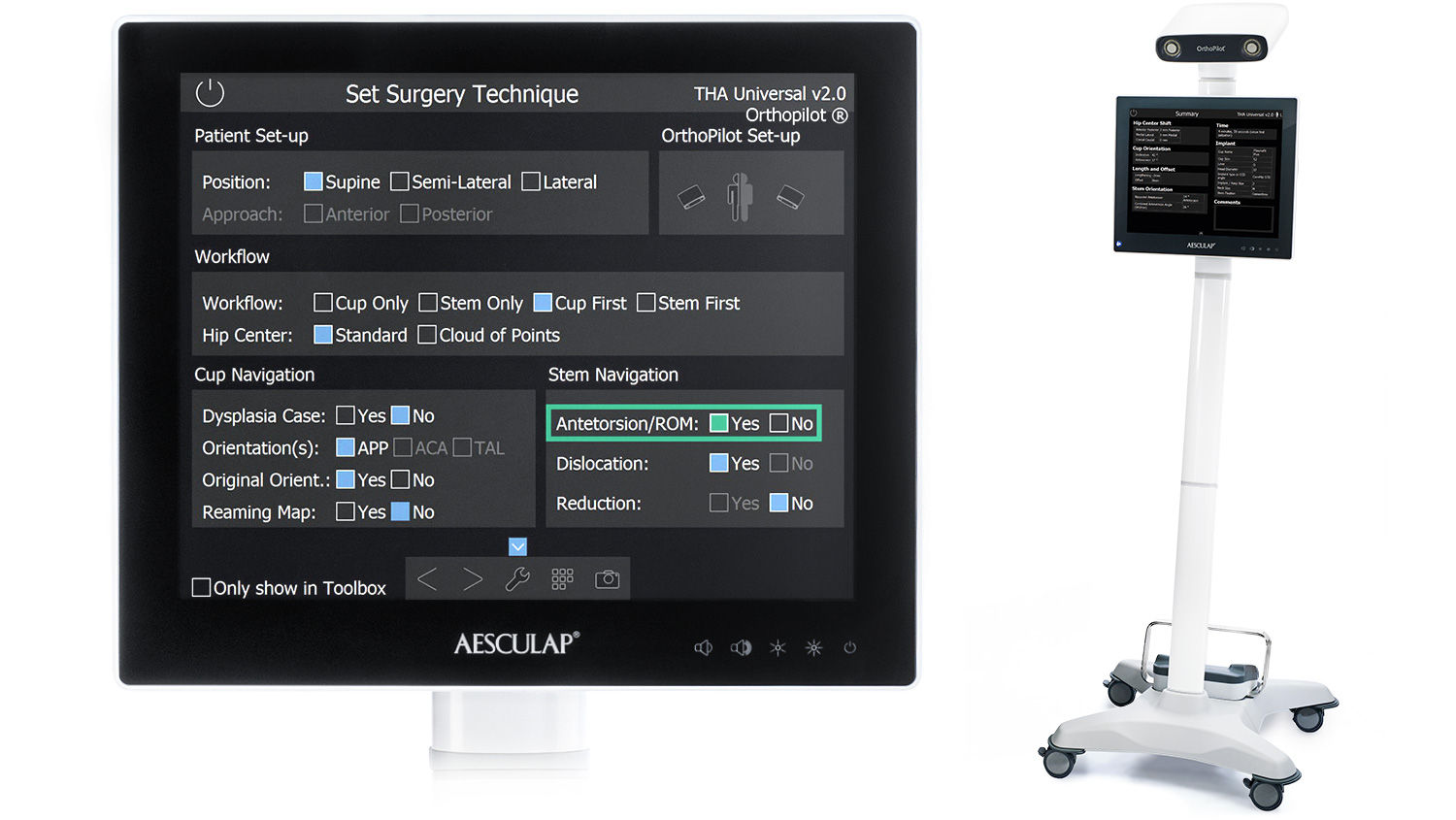 Il workflow THA Pro all'interno del THA Universal 2,0 di OrthoPilot offre la massima funzionalità. Oltre alla posizione e all'orientamento del cotile, vengono navigati tutti i più importanti parametri dello stelo: differenza di lunghezza dell'arto, offset e antetorsione dell'impianto di stelo e conseguente range di movimento (ROM) dei componenti dell'impianto, considerando l'orientamento del cotile. I risultati dell'impianto possono essere simulati prima dell'impianto dei componenti finali. Per ottenere le massime informazioni, è necessario fissare un terzo trasmettitore sul grande trocantere.