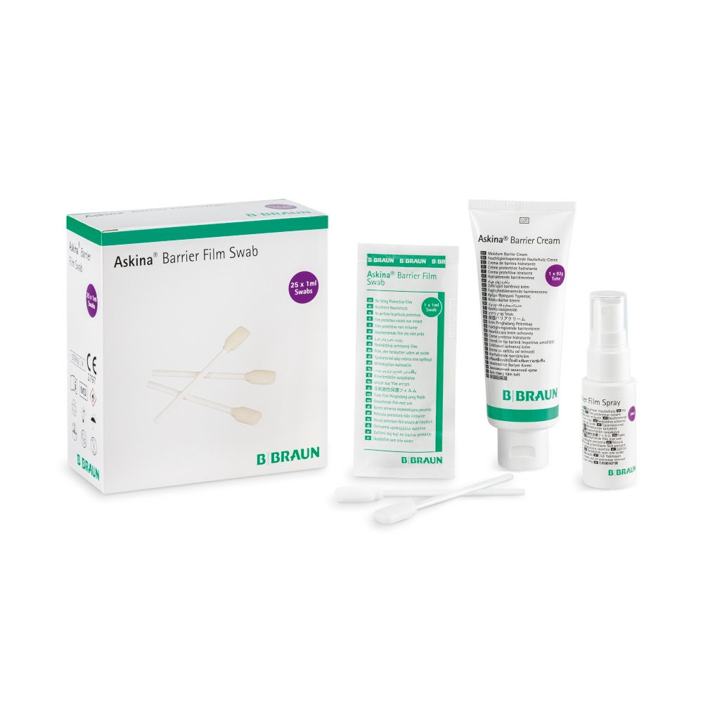 Askina® Barrier Film Spray è una medicazione liquida sterile che forma una pellicola trasparente uniforme quando viene applicata sulla cute. La pellicola può fornire permeabilità all'ossigeno e all'umidità. Può essere utilizzata su cute intatta o lesa. [20,21]