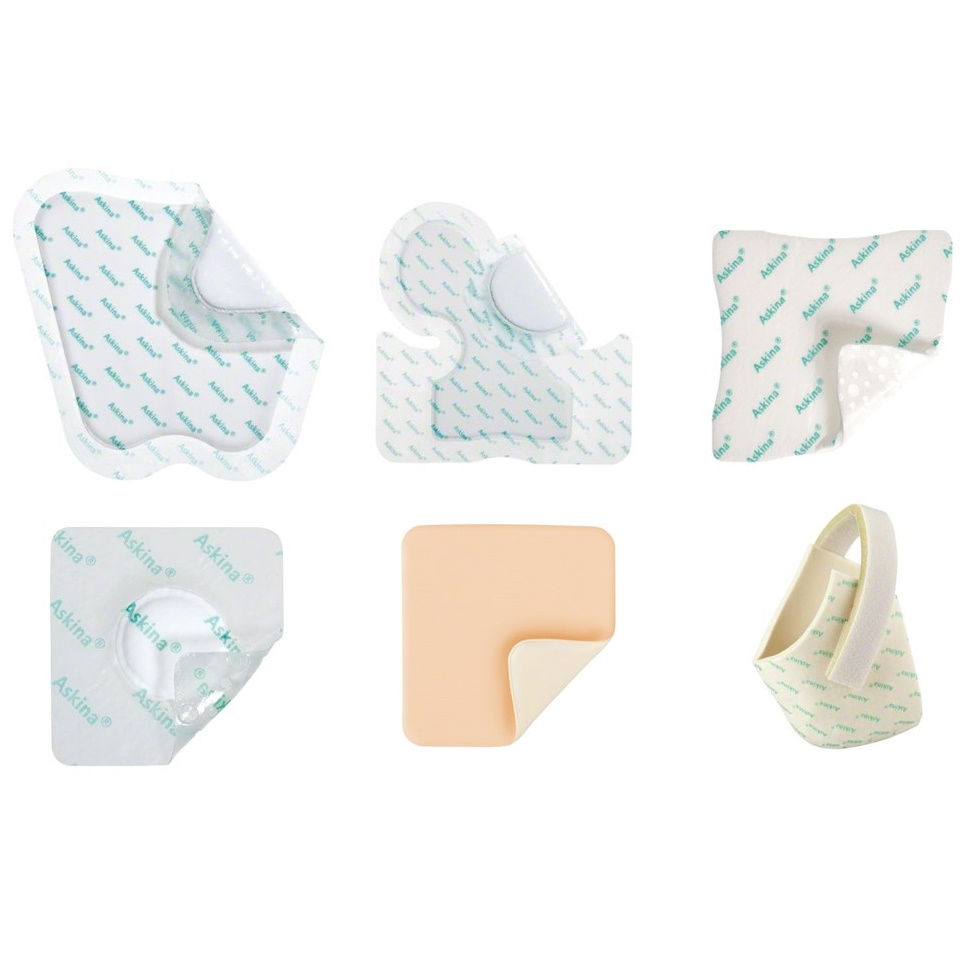 Askina® DresSil Sacrum, Askina® DresSil Heel, Askina® DresSil, Askina® DresSil Border possono contribuire a mantenere un ambiente umido che favorisca la guarigione naturale della lesione con una superficie di contatto in silicone perforato, una schiuma di poliuretano assorbente e un film di poliuretano esterno permeabile al vapore acqueo. Indicate per ulcere da decubito (PU), ulcere del piede diabetico (DFU), ulcere venose degli arti inferiori (VLU) e ustioni di 1°/2° grado. [14,15,16,17]