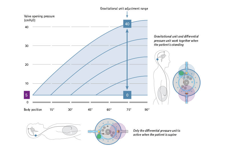 L'unità di pressione differenziale in M.blue® è disponibile nelle unità 0, 5, 10 e 15 cmH2O. La pressione di apertura selezionata dell'unità di pressione differenziale è ugualmente efficace in tutte le posizioni della carrozzeria. Quando è sdraiata, l'unità di pressione differenziale agisce da sola e di solito ha una bassa pressione di apertura selezionata, in modo che la valvola scarichi l'acqua cerebrale in tempo quando la pressione cerebrale aumenta durante le fasi di sonno e riposo. Una molla a microspirale che spinge una sfera in zaffiro in una sede a sfera è responsabile della corretta pressione. Se la pressione cerebrale supera la pressione di apertura selezionata, la molla cede, la valvola di pressione differenziale si apre e consente il passaggio del fluido cerebrale finché la pressione cerebrale non è di nuovo scesa di conseguenza.