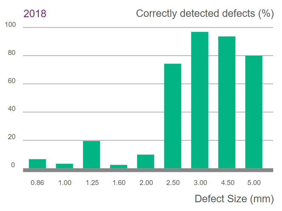Secondo uno studio, [1] i difetti con un diametro ≤ 2 mm non sono stati rilevati in modo affidabile.